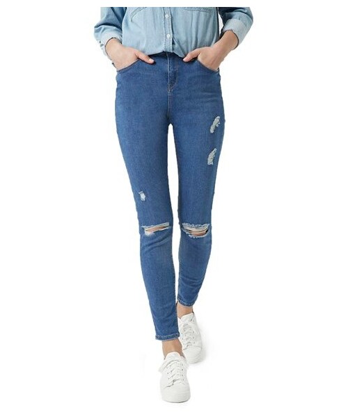 Threadbare patches and shredded knees add lived-in verve to high-rise skinny jeans cut from ultra-stretchy denim and cast in a medium-blue wash. 32" inseam; 10" leg opening; 10 1/2" front rise; 14 1/2" back rise (size 8 Tall). Zip fly with button closure. Five-pocket style. 92% cotton, 6% elastomultiester, 2% elastane. Machine wash cold, dry flat. By Topshop; imported.