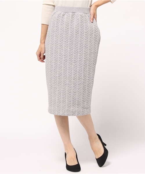 キルティングジャガードのデザインでお洒落感たっぷりに仕上げたタイトスカート。上品な膝下丈でバックにはスリットを施しました。タイトだけどウエストゴムなので履き心地は良好、ポケットつきも嬉しいポイントです◎