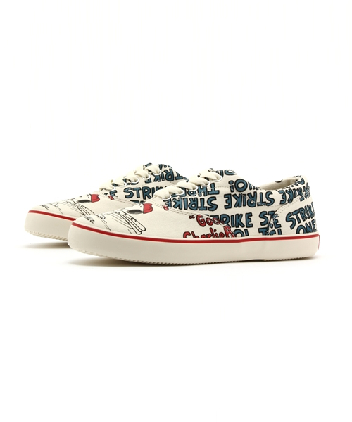 つま先には野球のす振りをしているかわいいスヌーピーのアートを使い、サイドには、<one strike,two strike,three strike>のロゴがプリントされた、野球好きにはたまらないスペシャルな一足♪ コーディネートし易い生成りのベースカラーでPEANUTSファンはもちろん、大人から子供まで楽しんで頂けるシューズが登場です。