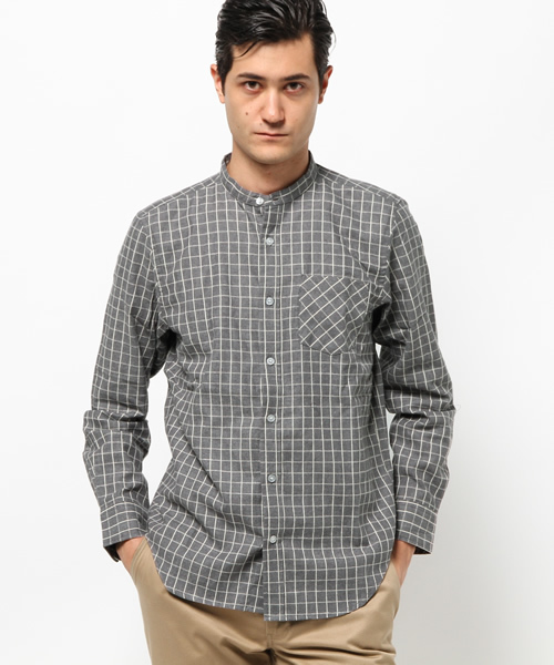 ウィンドウペン柄のドビー素材を使った長袖スタンドカラーシャツ。一枚でサラっと合わせても、インナーシャツとしてスタイリングするのも◎。ボトムはシンプルなものをチョイスして。3色展開でご用意しています。