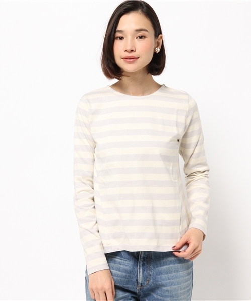 後ろ衿ぐりにタックが入ったボーダーカットソー。広がるタックラインでゆったりとした着心地。 前身裾脇に斜めに入った切り替えがアクセント。ボトムはパンツスタイルがオススメ。