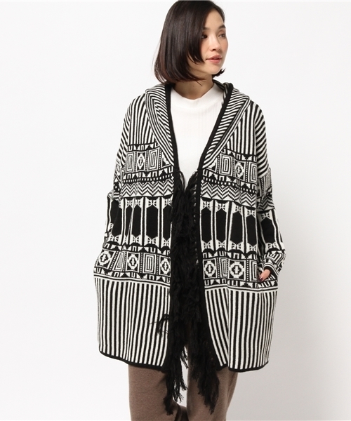 ノマド柄のニットコート。柔らかく温かみのあるウール/アクリル素材を使用しています。 ボタンや留め具の無い羽織りタイプで、ゆとりのある大き目なシルエットです。 やや長めの着丈で大人っぽく着用存在感のあるノマド柄と前立て部分のフリンジと大きめなフードがポイント。 パンツと合わせたカジュアルスタイルがお勧め。