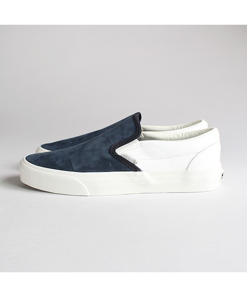 落ち着いた色合いのカラーリングでまとめられた VANS の定番でありアイコンでもあるスリッポンタイプの一足。アッパーのネイビー部分には上質なスエードレザー、ヒールのホワイト部分には表情豊かな表革を使用するという、表と裏のレザーのコンビネーションによってデザインされたこだわりの一足です。レザー部分には優れた撥水、撥油効果を持つ「Scotchgard(スコッチガード)」という薬品が塗られ、これにより、日常の汚れはもちろん、これからの季節の雨や雪による汚れを最大限に防止し綺麗な状態で履き続けることができます。また、インソールにはクッション性・通気性に優れた「Ortholite(オーソライト)」社製のインソールを採用。Ortholite社のインソールは防菌・防臭効果もあり、靴の中を清潔に保ってくれるという心配りがなんとも嬉しいポイントです。