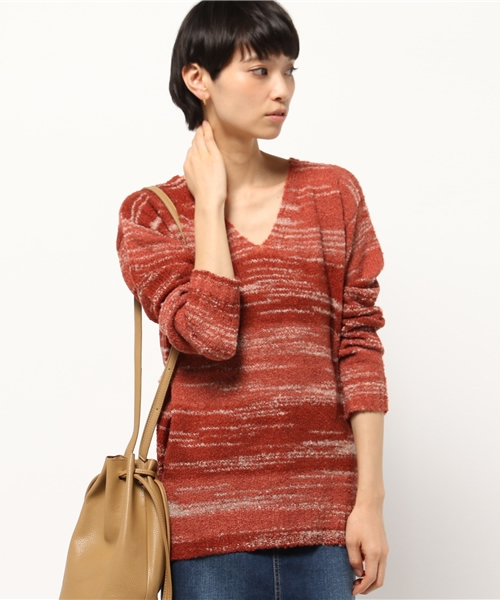1本の糸を複数の色で染め、グラデーションにしたMIX調のニットプルオーバーです。1枚でも様になる深めのVネック。お尻を丁度隠す安心のチュニック丈はパンツ合わせもおすすめです。