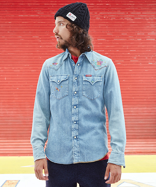 『注目の'70sムードを漂わせる、ヴィンテージさながらの一着』 左のヨークにユニコーン、右のヨークにジュピター、そして右の胸ポケットにロケットの刺繍をあしらい、トレンドの'70sムードに仕上げたウエスタンシャツ。リジッドから長年かけて着込み、補修を繰り返した一着をイメージし、要所には自然なエイジングの過程を忠実に再現したダメージ加工の他、手法や色が異なる数種類のステッチでリペア処理を施した。さらに、あえて違う色のスナップボタンを所々に使用することで、そのストーリー性に深みを与えると同時に、アクセント効果もプラス。秋や春のコーディネイトの主役になる、ファッションジェニックなアイテムとなっている。 その柔らかく優しい素材感は、デニムとは思えぬほど 上質なアメリカンコットンのムラ糸を、ヴィンテージ同様にロープ染色。さらに生地を織る工程での独自の調整により、レーヨンのような柔らかな風合いへと仕上げたライトオンスデニムを使用。洗うほどに雰囲気が増し、味わいのある表情へと育つのも楽しみ。 サラッと羽織るだけで、味気ないスタイリングの救世主に ベーシックななかにもしっかりと個性があるので、シンプルな着こなしにサラリと合わせるだけでも見映え&雰囲気がアップ! コーデュロイパンツやブーツカットデニムとのコンビでトレンドの'70s風にまとめるも良し、またキレイめスタイルのハズシとして取り入れるのも上級。