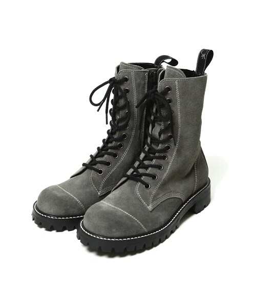 「MILITARIA SPECIAL LEATHER BOOTS」に待望のバックスキンバージョンが登場!東京は下町某所に構える老舗の靴工房と新たにタッグを組んで作られた編み上げブーツ。1点1点職人の手によって縫い上げられるそのブーツはどこか温かみのある芸術品と言っても過言ではない逸品。ソールは踵付きのイタリアンビブラム社のソールを採用。まさに日本の物創りの技術とイタリアの拘りが共鳴した一作。デザインは10ホールで絶妙な高さを設定し、サイドにユニバーサル社のジッパーを採用することによってシューレースをしたままでも容易に着脱が可能。MADE IN JAPANを誇りに世界へ誇れるクオリティとVIRGOの世界観がまさに「共鳴」された最高級のスペシャルブーツを是非ご体感ください。