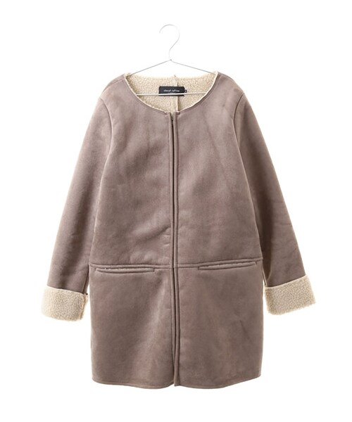 ムートン風のノーカラーコート。裏がアイボリーのボアになっているフェイクムートンを使用。大人っぽいノーカーラーがポイント。袖口部分が切り替えのボア使いになっていて、フェミニンな印象の仕上がりになります。