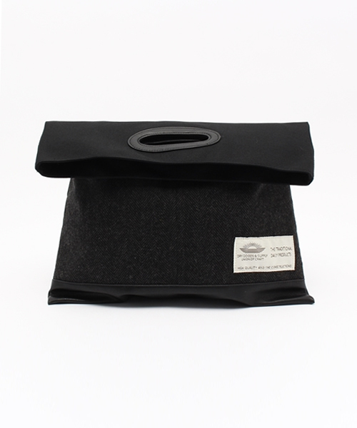 随所をフェイクレザーで切替えたクラッチバッグ。ハンドバッグとして2WAYでお使い頂けるのが魅力のひと品。落ち着きあるカラーリングが着こなしにシックな雰囲気を演出します。男女問わずユニセックスでお使い頂けるので、ご自身用は勿論、プレゼントにもオススメです。