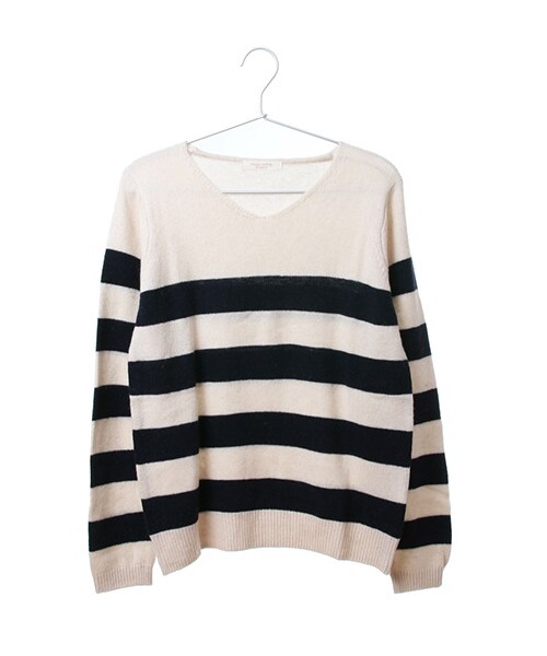 太ボーダーのパネルニットプルオーバーです。ウォッシャブルなので自宅で簡単に洗濯機で洗えるのも嬉しいポイント。Vネックは顔回りをシャープにすっきりと見せてくれます。大人っぽい上品なアイテム。