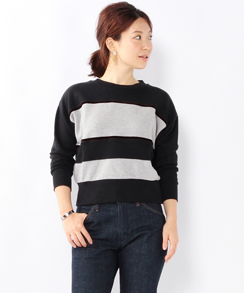 程よく詰まったネックラインでトレンド感満載。シーズンレスで活躍するコットン100%で仕上げた、柔らかなスウェットです。 無地やロゴTに飽きたら、ライン入りデザインがおすすめ!フロントはボーダー風の切り替えデザインで、バックは無地という新鮮なデザインが魅力です。 いつものデニムスタイルから、今年らしいマニッシュな着こなしにも好相性な一着です。 ゆったりめなシルエットなので、ルーズな感じで着こなすのがポイントです。 着丈が短めなので、ボトムとも合わせやすいアイテムです。