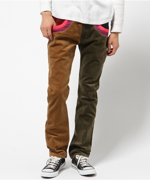 刺繍生地を叩き付けたバックポケット際立つスキニーパンツ。 ボディにはストレッチコーデュロイを使用しており、快適な着用感。 サイドポケットもアクセントとなる生地で切り替えています。 スキニーでありながらも、コーデュロイ素材を使用することで季節感ある1着に。 ざっくりとした刺繍生地はダメージが入りやすく、使い込め使い込むほど雰囲気が増します。