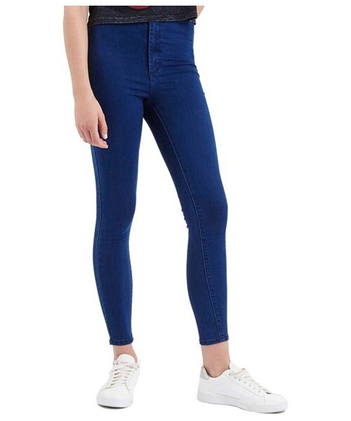 Super-skinny jeans in a high-rise, flat-front style are cast in a rich blue wash that adds a pop of color to your look. The cropped hems are perfect for showing off your footwear. 26" inseam; 9" leg opening; 10 1/2" front rise; 14" back rise (size 8). Zip fly with button closure. Back patch pockets. 67% cotton, 29% polyester, 4% elastane. Machine wash warm, line dry. By Topshop; imported.