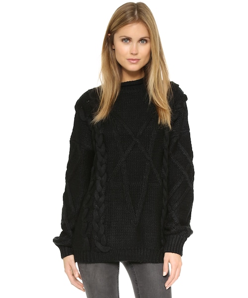 A chunky cable-knit UNIF sweater in a slouchy silhouette. High neckline and ribbed edges. Long sleeves. Fabric: Cable knit. 100% acrylic. Dry clean. Imported, China. Measurements Length: 24in / 61cm, from shoulder Measurements from size S