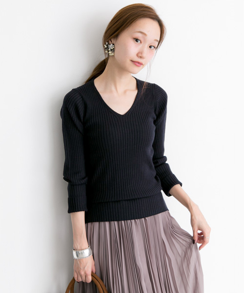 ざっくり感のあるワイドリブのVネックニットプルオーバー。 太めリブが縦ラインを強調してすっきりとお召しいただけ、フィット感がありながらも一枚でも着やすく活躍してくれること間違いなし。 定番シンプルアイテムとして、色違いで持っておきたいニットです。 ※カラー名「KHAKI」の商品は、 実際はマスタードに近いお色味になっております。 ※この製品は、長時間日光や蛍光灯にあたると、変色する場合がありますので、ご注意ください。 また、強い摩擦や濡れた状態での摩擦により色が移ることがありますので、ご注意ください。 素材の特性上、引っ掛かりやすくなっておりますので、ご注意ください。 ※その他お取り扱いに関しましては、商品に付属の下げ札をご確認の上、充分ご注意ください。