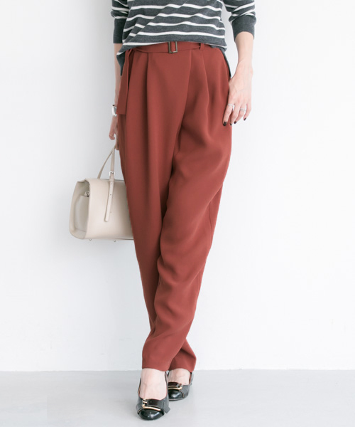 フロントをクロスさせたようなラップ風のデザインが特徴的なパンツ。共布のベルト付で、タックインが綺麗にキマる一本です。 ハイウエストのパンツで、スタイルアップ効果があり、裾にかけて効果的に細くなるテーパードシルエットがよりスマートに履きこなせる仕上がり。とろみのある軽い素材ですので、ボリュームのあるニットとも好相性。ワンピースなどとのレイヤードでももたつかずに、綺麗に履いて頂けます◎