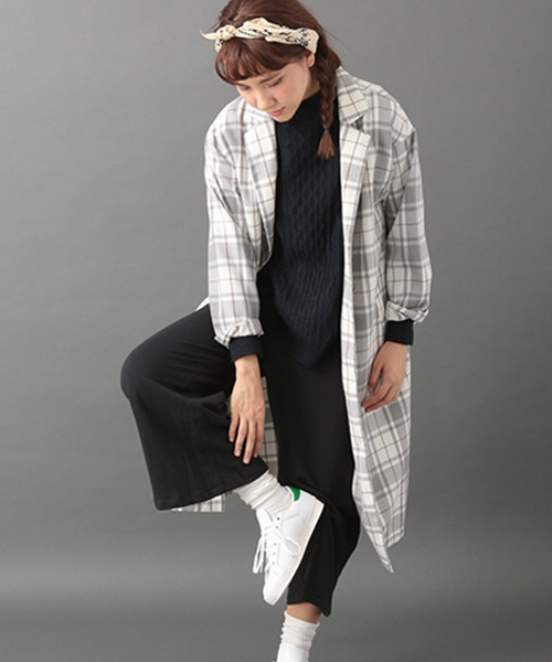 エステルレーヨンチェックロングジャケット 。ポリエステルとレーヨンのチェックでこの時期にジャストで着用頂ける素材。流行のロングジャケット。ボックスシルエットが幅広いスタイリングに対応できます。