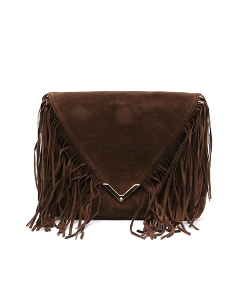 V字カットのフラップにメタルモチーフでアクセントを添え、エッジにロングフリンジをあしらったショルダーバッグ。フェイクスウェードのウォーム感が相まって、シーズンコーデにぴったりのトレンドを押さえたルックスに仕上がっています。ストラップを外せばクラッチにもなる2WAY仕様です。