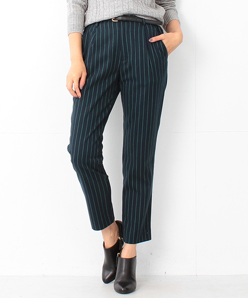 すっきりと細身のラインを描く8分丈パンツ。ベーシックカラーにアクセントを効かせたストライプが目を惹くひと品です。取り外し可能なブラックベルト付きな点も嬉しいポイント。シンプルなトップスと合わせるだけで、ワンランク上の装いの叶うアイテムをぜひどうぞ。