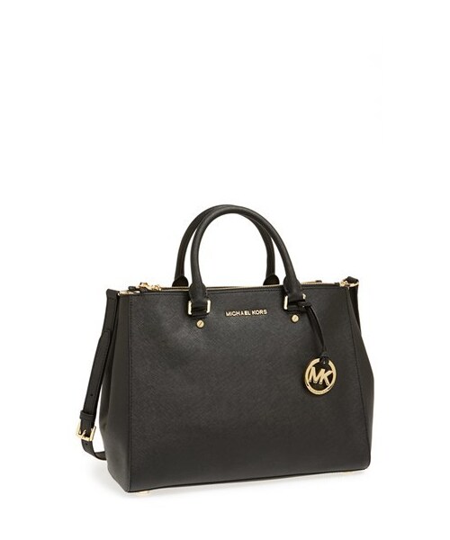 High-shine logo letters finish a sophisticated, lightly structured tote crafted from saffiano leather. A trio of interior compartments keeps you entirely organized on-the-go. Magnetic snap-tab and dual zip closures. Snap gussets. Interior zip, wall and cell phone pockets; key clip. Logo lining. Protective feet. Leather. By MICHAEL Michael Kors; imported.