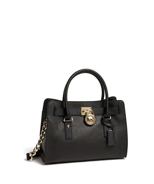 A goldtone logo lock adorns a timeless satchel cut from finely textured Saffiano leather. Magnetic-snap closure. Interior zip, wall and cell-phone pockets; key clip. Protective metal feet. Logo-jacquard lining. Saffiano leather. By MICHAEL Michael Kors; imported.