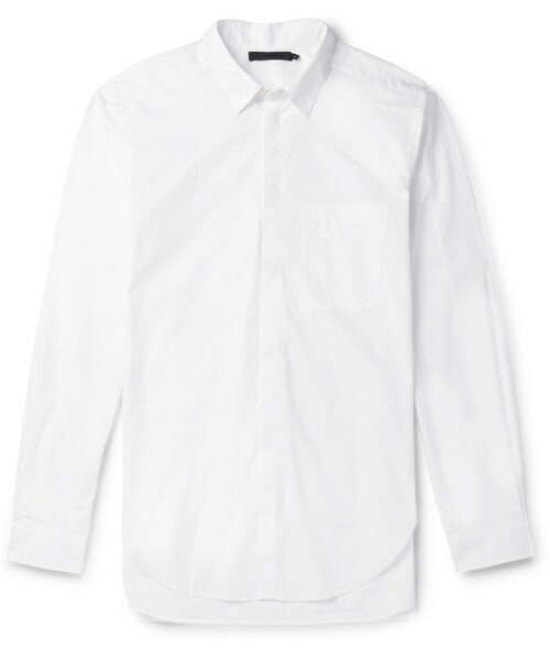 Alexander Wang 's cotton-poplin shirt may look minimal, but discreet detailing gives it a cool, offbeat feel. The concealed button placket keeps this piece clean-lined, while the hem is cut in a curved shape at the front and square at the back for a subtle, directional twist. Wear yours untucked with trim-fit trousers to highlight its angular profile. White cotton-poplin Chest pocket, buttoned cuffs, notched side inserts, curved front hem, back pleat, square back hem 100% cotton Machine wash or dry clean