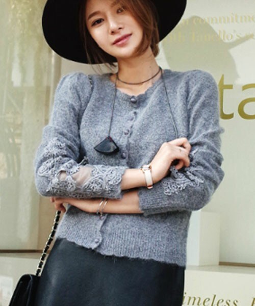 ネックラインのヘムと袖口の華やかでクラシックなモチーフレースで、フェミニンで上品なショートカーディガンです。アンゴラ混のニットなので、柔らかくてあったか♥ ※WEARに記載してある金額と、DHOLIC通販サイトに記載してある金額にシステム都合上、稀に誤差が生じます。正しい金額はDHOLIC通販サイトに記載された金額です。