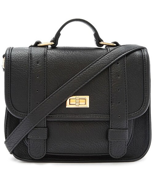 STYLE DETAILS: This faux leather satchel features two decorative straps at front, a twist-lock closure, top handle, and adjustable shoulder strap. High polish hardware Fully lined Shell: 100% Polyurethane; Shell: 100% Polyester Made in China FIT DETAILS: 8" height x 8.5" width x 3" depth