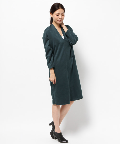 フェイクスエード特有のマットな光沢感が目を惹くワンピース。ドロップショルダーと着丈長めのゆったりとしたシルエットながら、ネックラインを細めのV字開きにしたことですっきりとした印象に仕上げました。手洗い可能でご自宅でお手入れできる点も嬉しいポイント。HATと合わせて今年らしいスタイリングを楽しんでみてはいかがでしょう。
