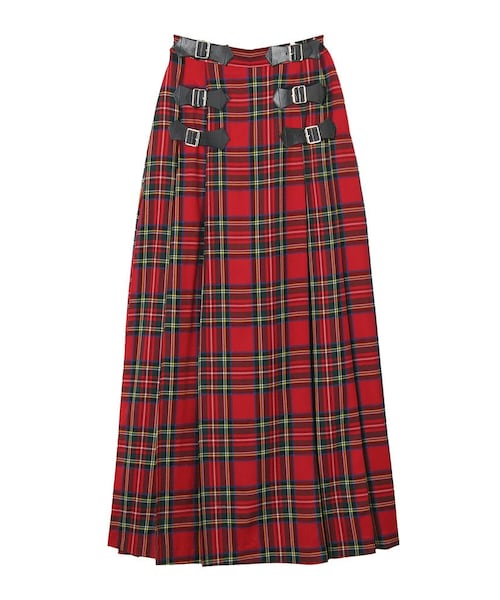 パンクスの定番、プリーツチェックスカートをフルレングスにアレンジし、モードな雰囲気に。 ウエストベルトの背面にはアジャスターベルトがついておりサイズの調整が可能です。 大ぶりな飾りベルトも印象的。 右サイドのスラッシュポケットも嬉しいポイント。 スッキリとしたシルエットの縦のラインが作れスタイルアップ効果も。 モード感のあるパンクススタイルに是非おすすめです。