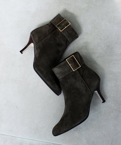 履くだけで女性らしい足元になるシルエット自慢のブーティー。 シンプルで華奢なシルエットに履き口のバックルのデザインがアクセント。 合わせやすいブラックの他、今年1足は欲しいカーキのカラーをご用意しました。 タイツに合わせてスカートに、ガウチョパンツなどのパンツスタイルにとコンパクトなデザインなので、ボトムを選ばず活躍します。 ※かかと部分にある小さな穴は、レザー商品の製造工程上必要な、木型と革を止めておくために釘をさす穴で、必ず出来てしまうものになります。 不良ではございませんので、ご了承ください。