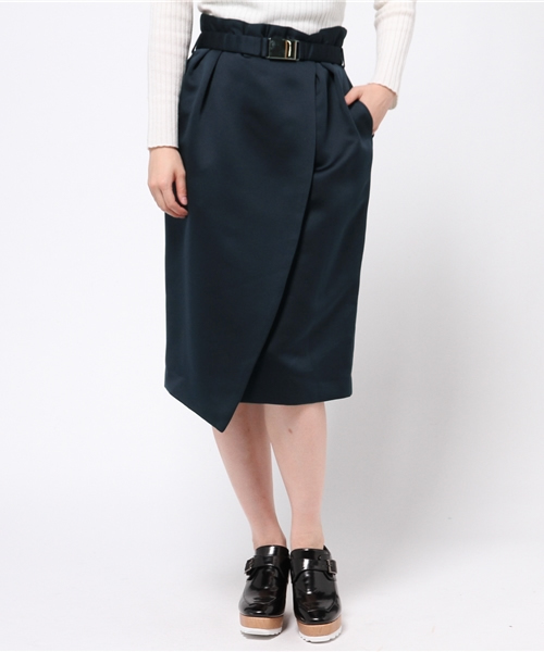 花びらをくるっと巻いたようなフォルムが女性らしいスカート。サテンのさりげない光沢感が色合いを上品に見せます。ベルトのウエストマークでスタイルアップ効果も期待できます。