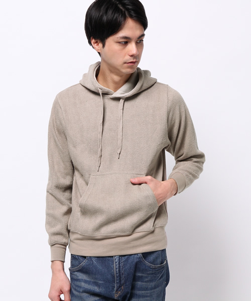 ヘリンボーンのような柄が個性的な素材。裏毛生地を裏使用しています。シンプルな無地のフード付きパーカーなのでどんなコーディネートにも合わせやすく、色合いもヴィンテージ風なのでカジュアルにまとめるのがオススメ。