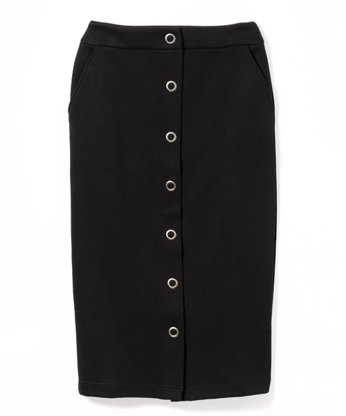 張りのあるダンボールニット素材を使用したタイトスカート。 膝下のクロップド丈が今っぽい。フロントボタンもポイントです。 Iラインなのでボリュームのあるニットなどを合わせても◎。 お揃いのトップスとセットアップで着るのもオススメ!