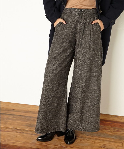 SLYオリジナルのツイード素材です。足首が見えない、かかとぎりぎりの丈感です。ペタンコのマニッシュシューズやスニーカー、ヒール、両方と合わせられる丈にしたのがポイントです。シンプルなニット、デザインの入ったニット、どちらと合わせても今年らしく使えるボトム☆