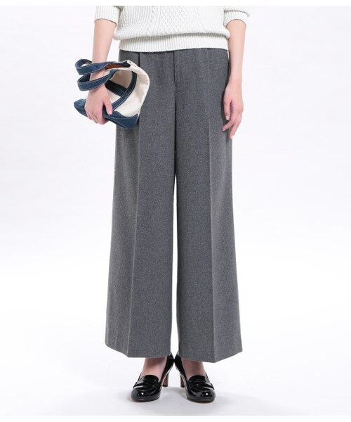 温もり感のあるフラノ素材を使用した、秋冬にぴったりのワイドパンツ。まだまだ続くトレンドのワイドシルエットで、今年らしいスタイリングをメイクしてくれます。センタープレスが脚長効果を発揮するのもポイント。パンプスなどヒールのあるシューズと合わせてスラッと縦長スタイルを作るのがスタイルアップのコツ。