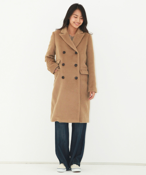 温かく品のあるシャギー生地を使用しています。 柔らかな毛足の質感が表情豊かな素材です。 ポケットデザインがクラシックな、ダブル仕立てのコートは大人っぽくシックな仕上がりになっています。 タイトめなシルエットでスタイルアップ効果のある一枚となっています。 デイリーに着まわしの効くアイテムです。