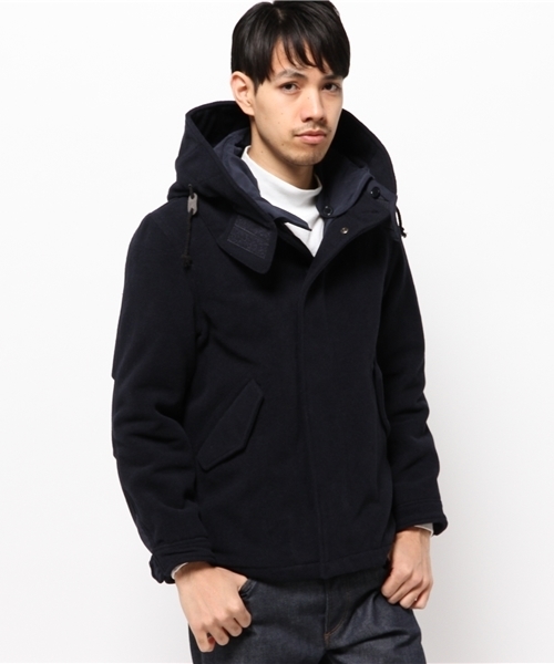 柔らかいメルトン地なので、動きやすく、着やすいのが特徴です。ショートフードコートですが、フードは取り外し可能。2WAYの雰囲気の違ったスタイリングを楽しめます。キルティングの裏地が付いて、保温性も高いのもポイント。様々なスタイリングに合わせられる、使えるアウターです。