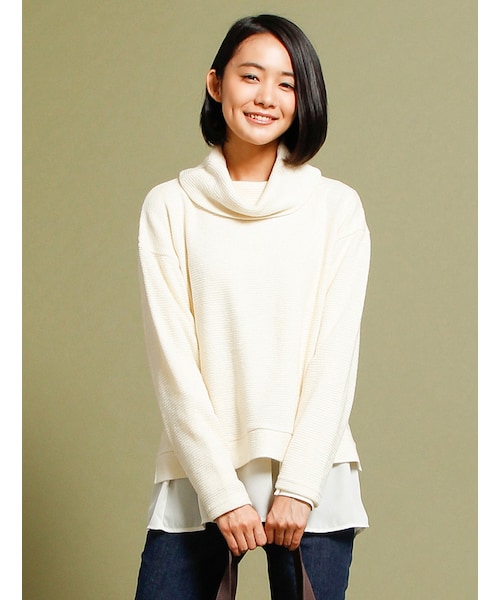 旬のレイヤードタートル。タートルデザインのゆるトップスとふんわり揺れるフレア裾がフェミニンなトップスの重ね着スタイルが楽しめるアンサンブル。いつものパンツコーデも女性らしく着こなせます。