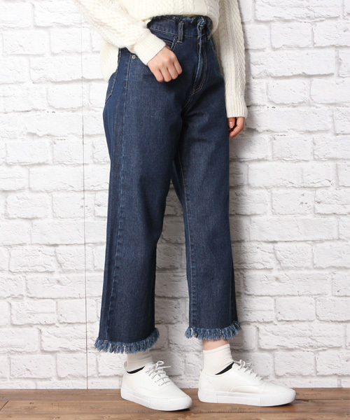 ウエストと裾にフリンジ…☆ ウエスト部分と裾にフリンジを取り入れたこちらのデニムパンツは、はくだけでトレンド感のあるスタイルに☆ 10オンスのしっかりとしたデニムを使用し、ワイドシルエットが綺麗に出るのが嬉しいところ。また股上を長めに取り、後ろポケットの位置を高めにしているので、脚長効果、小尻効果のある1枚です◎ フリンジをポイントにトップスをインしたり、ポンチョやボリュームのあるトップスを合わせても可愛いです♪