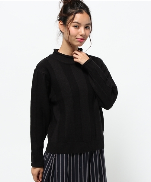 WHO'S WHO gallery(フーズフーギャラリー) ワイドなストライプの編み地がコーデをスッキリまとめてくれるボトルネックニット。くるっと丸まった首元と袖口がさり気ないポイントで、シンプルながらもディテールにこだわったニットに仕上がっています。着丈は腰回りでボトムスを選ばないサイズ感。トレンドのワイドパンツやロングスカートにも好相性のアイテムです。