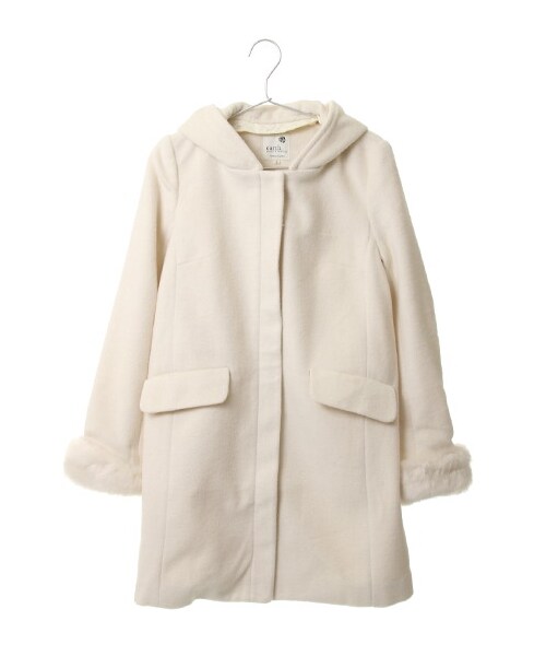 フードと袖口のファーが取り外し可能なミディ丈コート。フードを付ければカジュアルに!フードを取り外せばノーカラーデザインでエレガントでフェミニンな印象。フロントも比翼デザインなので、フードと袖口ファーをすべて取り外すとシックでシンプルなコートに早変わりです!