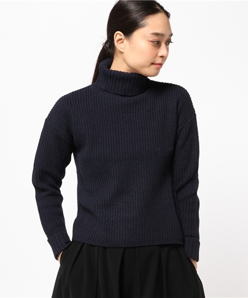 畦編みのニットプルオーバー。 オフショルダーとタートルネックがリラックス感のあるムードに。 ショート丈なので、ふっくらボリューミーなシルエットもコンパクトに収まります。 パンツ、スカートどちらとも相性が良く、使いやすい一枚。