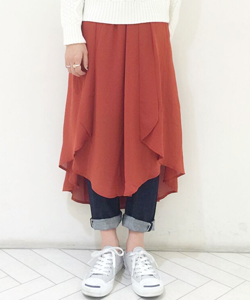 mystic(ミスティック) 優雅に波打つラッフルフレアがエレガントなシフォンスカート。裾に動きが出るようにテールラインのカットワークを効かせました。足元がほんのり透けるので、大人っぽく印象も軽やか。フェミニンなムードを活かして、カジュアルなトップスやアウターに合わせれば、ミックス感のあるコーディネートが楽しめます。
