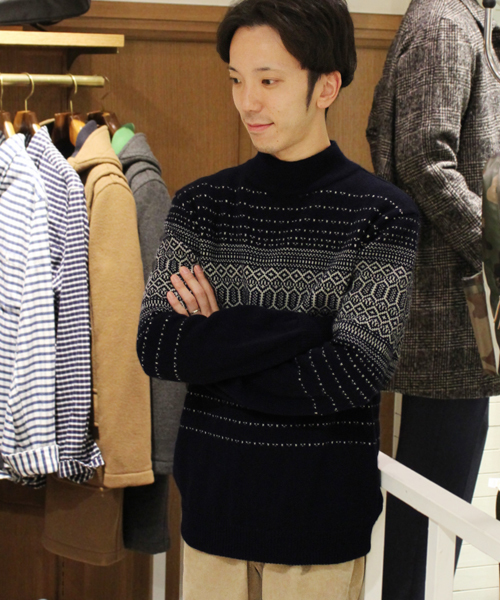 シンプルなフェアアイル柄のモックネックニットです。 リブではなく、同じ編地で衿が立つ様にデザインされたネックはカジュアルに見せたい時のチェスターコートのインナーとしても相性良く使って頂けます。 暗くなりがちな冬のスタイリングにアクセントを与えてくれる1枚です。 ※取り扱いについては、商品についている品質表示でご確認ください。 ※店頭及び屋外での撮影画像は、光の当たり具合で色味が違って見える場合があります。 商品の色味はスタジオ撮影の画像をご参照ください。 着用スタッフ身長:167cm 着用サイズ:38