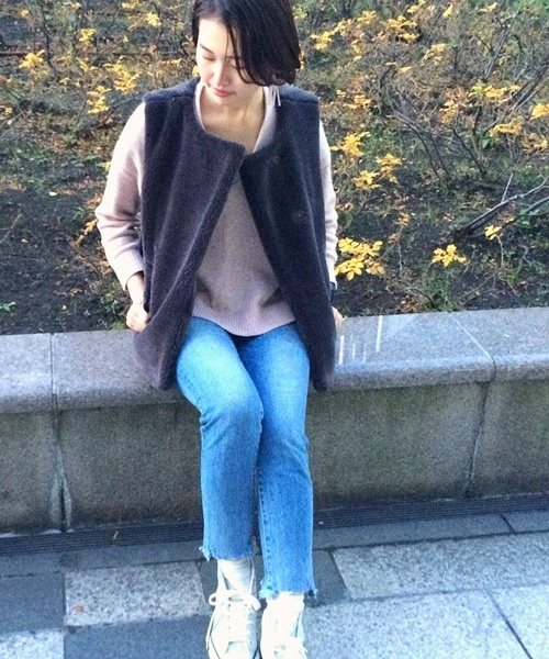 Kastane(カスタネ) 見た目はもちろん着心地も暖かなモコモコボアベストです。素材のボリューム感はそのままに、ノーカラー&比翼フロントでシンプルにデザインされているので、きれいめなコーディネートにもお使い頂けます。少しコンパクトなアウターやブルゾンの上に羽織っても◎