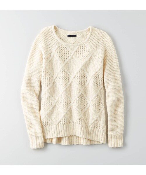 鹿の子と透かし編みを入れたダイヤパターンの ユニークな表情がオシャレなセーター。 コットン53%、アクリル27%、ナイロン9%、ウール7%、ポリエステル3%、ポリウレタン1% 、ソフトなブレンドニット、イージーイット、クルーネック、透かし編み、袖口と裾はリブ お手入れ方法:洗濯機洗い