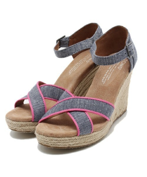 これからのシーズンに必須のトムスは、ナチュラルなデザインと優しい履き心地で、世界中の女性を虜にしています。流行に左右されない安定感も魅力です。 TOMS定番Wedgesの “Strappy Wedges”。高めのヒールながら、アンクルストラップつきなので安定感もバッチリなサンダルです。ソール部分の柄が、他にはない一足。ベージュとライトブルーはコルクソール。 その履き心地の優しさを体感してみてください。 TOMS(トムス)は、2006年にブレイク・マイコスキーによってアメリカで誕生しました。始まりは、ブレイクがアルゼンチンへ行った際、現地の子供の小さな足を守るべき靴がない事実を受け、何かできることはないだろうかと思い立ったのがきっかけです。 【One for One.】TOMSが設立当初から行っている活動です。商品を一足購入ごとに、靴を必要としている子供に一足寄付されるチャリティーは、現在までに1千万足以上を世界中の子供たちへ届けています。どこか懐かしいデザインと軽くて履きやすい靴は、日本も含め世界で人気があります。