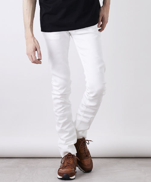 超長綿を使用したスキニーデニム。 タテ糸に超長綿の双糸を使った高級デニム素材を使用しています。 デニム産地では本来、双糸を使用することはまずありません。 単糸で出来ることを双糸でやることのメリットはありませんが、デニム本来の風合いを活かしながらもエレガントなデニムを追求すると下記のような3点のメリットを出すことができます。 ①糸染め:地場の岡山。 INDIGO:濃度を限界まで上げています。 BLACK:タテ糸は硫化染めの濃度限界のクロですがヨコ糸は反応染めにすることにより着用面の堅牢度を良くしています。 ②織り:シャツ地産地の兵庫県の西脇でやることによってタテ、ヨコの打ち込み本数の調整をできるようにしました。 ③仕上げ:岡山で行うことによってデニムの本来の風合いを損ないません。 このように岡山で作られた海外メゾンにも使われているデニムを国内最高峰の技術を持つ広島の工場にて縫製しています。 そしてパターン、カッティングに関してもダーツをしっかりとりヒップの丸みを作り、後ろの股上を高くとる事によりヒップ周りのストレスを軽減していたり、ポケットの位置を高めに設定し脚長効果を生み出していたりと、いかに美しく、デニムというアイテムでエレガントさを出せるかに力を注ぎ制作しました。 スキニータイプなのでストレッチも程よく利かせ、穿き心地にも繊細な調整を加えています。 リベットやネオバボタンにはUNITED TOKYOオリジナルを使用。 ベルト裏には滑り止めを施し、タックインしても出てきにくい仕様になっています。 日本の職人の技術の粋を集めた珠玉のデニムです。 ※同素材でシルエットの異なるタイプ ストレート【9598148】タイトストレート【9598149】もございます。