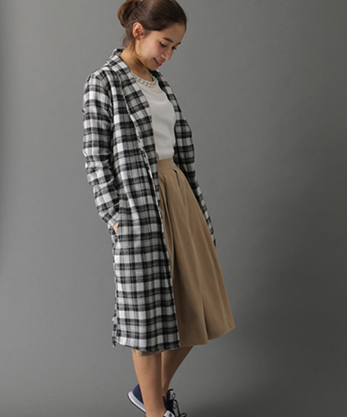起毛感のあるネル素材を使用したチェックガウンコート。モノトーンカラーのブロックチェックと、グリーンタータンチェック、ネイビー系のタータンチェックの3パターン展開です。両脇にポケット付きで実用的です。サラリと軽く羽織って恰好良くて着こなして!