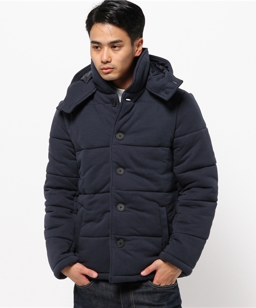 中綿がしっかりと詰まったブルゾン。表面の生地感は柔らかいポリエステル混のコットンを使用。中綿が入っているので、ボリューミーなシルエットになっています。フード付きで衿周りにもボリュームがあるのでマフラー要らずなアウターです。